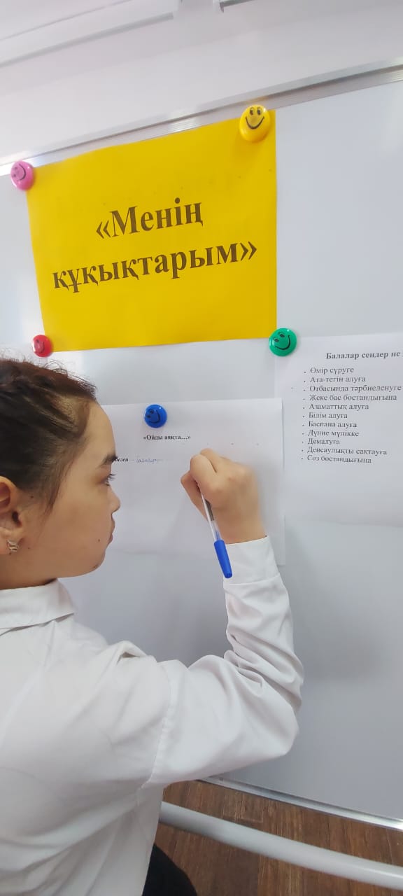 13-19 ақпан аралығында "Сен және сенің құқығың" атты апталық жоспары құрылып өтілуде. Оқушының құқықтары мен міндеттері туралы білімдерін толықтыру. Оқушыларды адам құқықтарына оқыта отырып, түсініктерін қалыптастыру, Өз міндеттері мен құқықтарын білуге үйрету. Қазақстанның болашағына үлесін қоса білетін білімді де, ізденімпаз ұрпақ етіп тәрбиелеу мақсатында өтті.