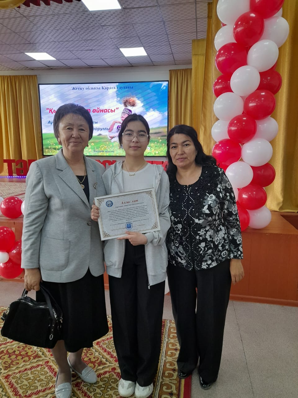 Оян ауылындағы МДШО бар орта мектебінің 8 сынып оқушысы Құдайберген Үміт "Қыз адамзаттың айнасы" тақырыбында өтілген Аудандық аналар мен қыздар форымында Мәншүк Маметованың "Анаға хат" монологін оқыды. Осындай тәрбиелі , тәртіпті, өнегелі қыз баланы өсіріп тәлім тәрбие бергені анасы алғыс хатпен марапатталды.