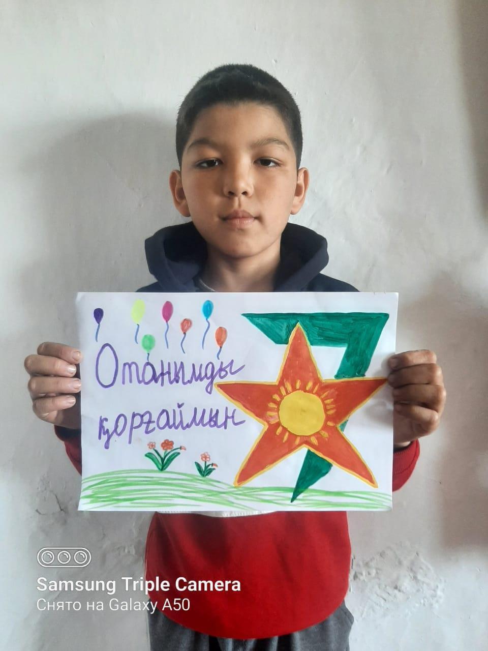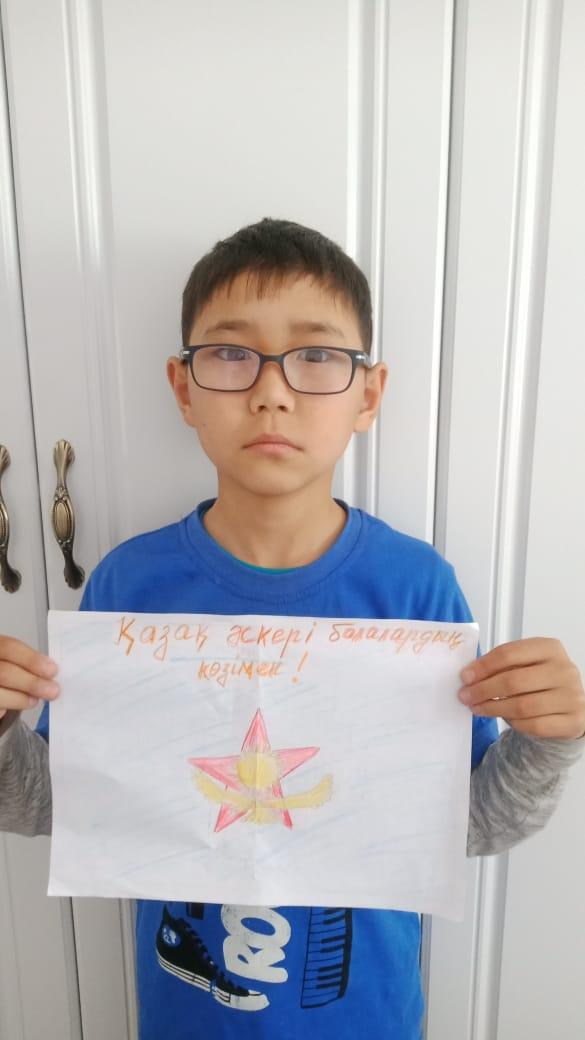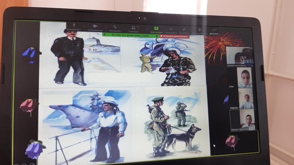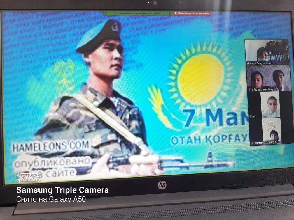 5-7 сыныптар арасында «Қазақстан әскері балалар көзімен» тақырыбында балаларға 7 – мамыр Отан қорғаушылар күні мерекесін сезіндіру. Ұлы отан соғысының мазмұнын әңгімелеп осы соғыста ерлік көрсеткен барытлардың ерліктерін, жыл сайын жеңіс күнінің мерейлі мерекесін бүкіл халық тойлап отыратынын айтып, жеңіс салтанатын көре алмай кеткен боздақтардың, бүгінде саны азайып қалған майдангерлердің рухына бас ие отырып, балалрды отан қорғауға, Ұлы отан соғысының батырларының ерлік істеріне тағзым етуге батыл да ержүрек болуға үрету. Елін, жерін жаудан қорғай білуге, елінің потриоты болуға тәрбиелеу мақсатында өтілді.