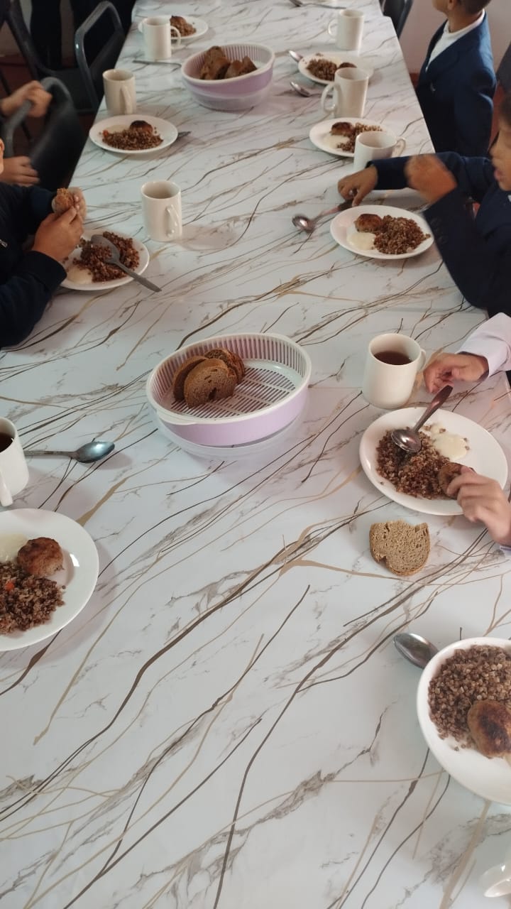 Тегін ыстық тамақпен қамтылған оқушылардың тамақтануы.
