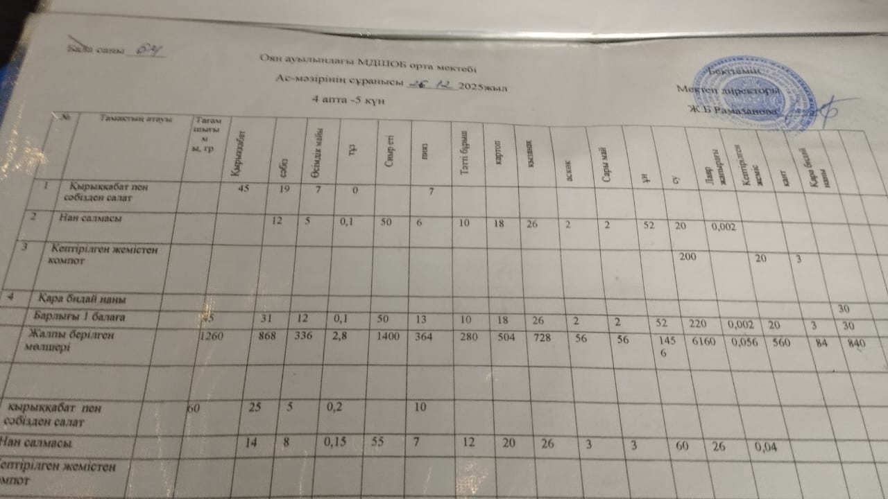 Жетісу облысы Қаратал ауданы "Оян ауылындағы мектепке дейінгі шағын орталығы бар орта мектебі" коммуналдық мемлекеттік мекемесінің жалпыға бірдей білім беру қорынынан тегін ыстық тамақпен қамтылған оқушылардың тамақтануы.