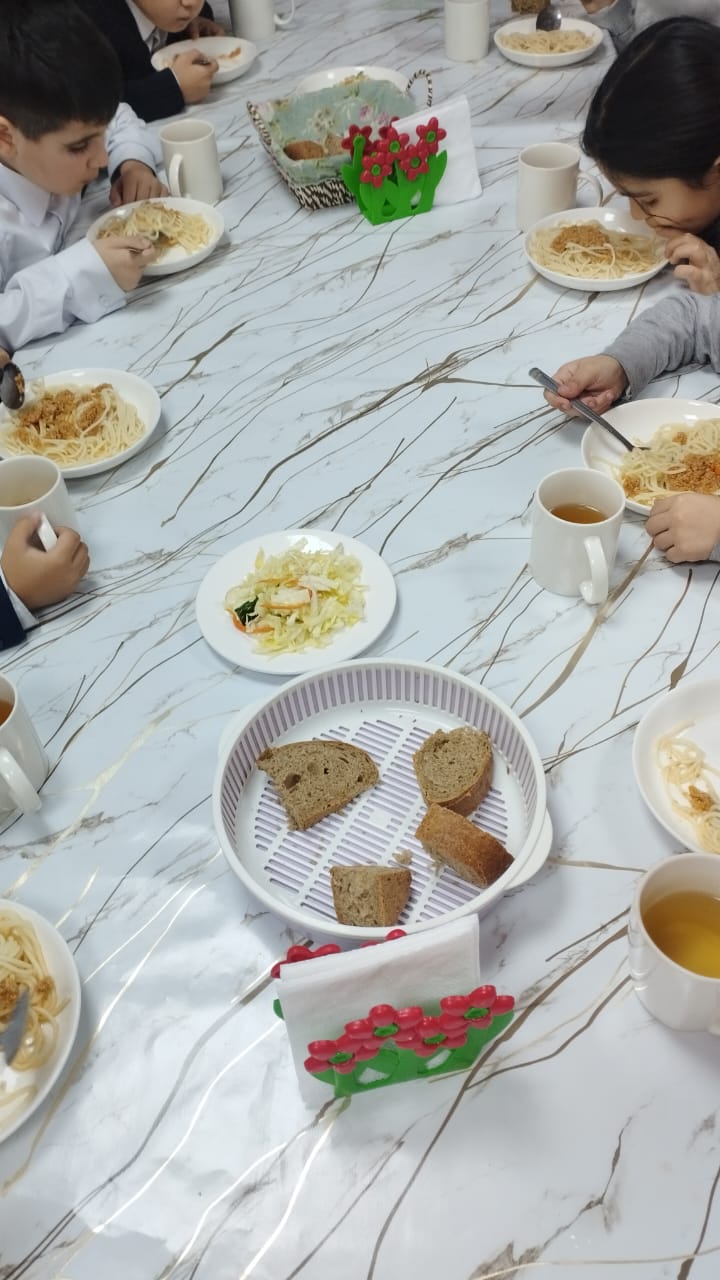 Тегін ыстық тамақпен қамтылған оқушылардың тамақтануы.
