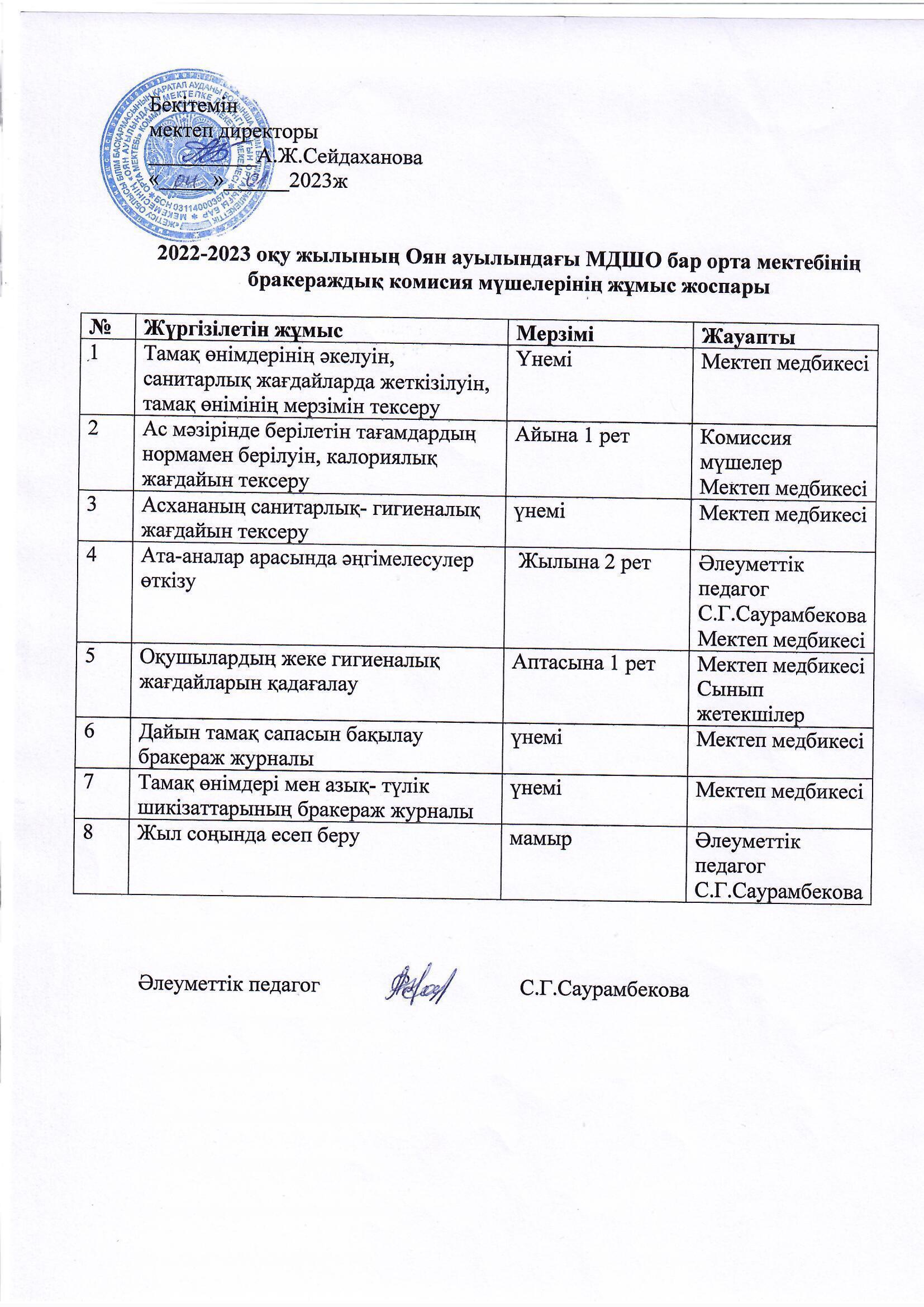 Бракераждық комисия мүшелерінің жұмыс жоспары